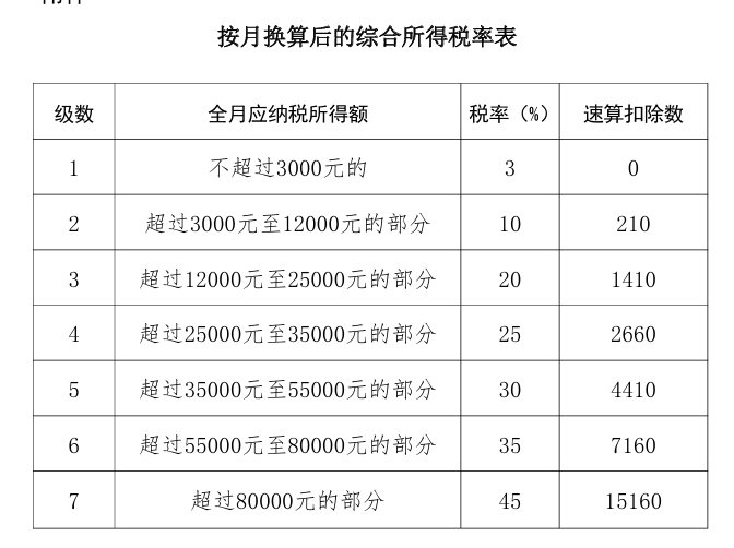 1. 將全年一次性獎金/12后得到的數額,按照下表確定適用的個稅稅率和速算扣除數。